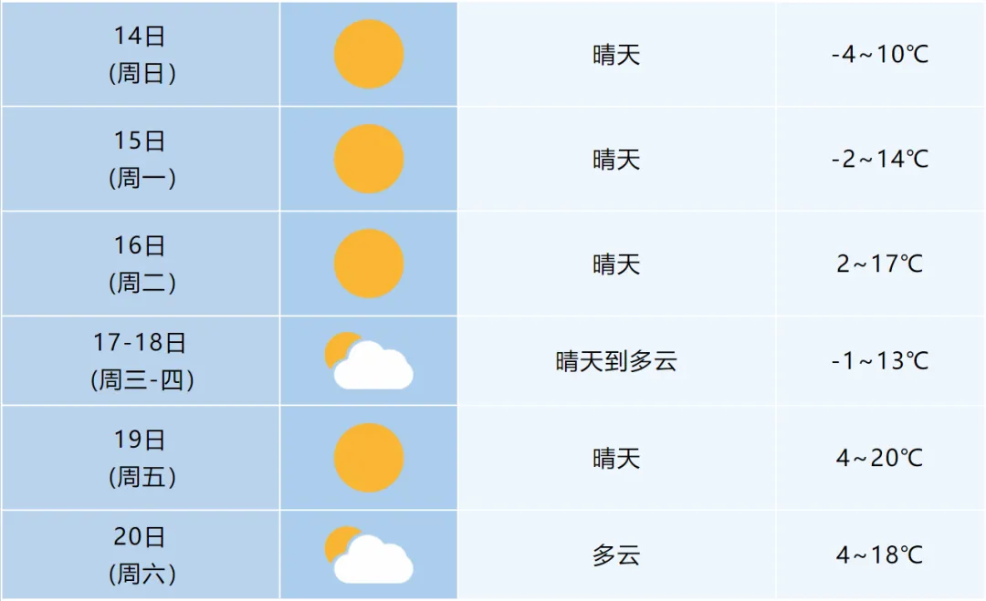 合肥市氣象臺(tái)預(yù)報(bào)顯示,寒潮影響已趨于結(jié)束,未來7天合肥以晴天為主。受冷空氣影響,今晨最低氣溫降至-4℃,15日起氣溫將逐步回升。