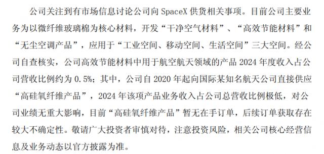 針對(duì)市場(chǎng)關(guān)注的向SpaceX供貨事宜,再升科技表示,公司核心業(yè)務(wù)是以微纖維玻璃棉為基礎(chǔ),開(kāi)發(fā)“干凈空氣材料”“高效節(jié)能材料”和“無(wú)塵空調(diào)產(chǎn)品”,應(yīng)用于工業(yè)、移動(dòng)、生活三大空間。經(jīng)自查,2024年公司高效節(jié)能材料中航空航天領(lǐng)域產(chǎn)品收入占比約0.5%;2020年起向某國(guó)際知名航天公司直接供應(yīng)“高硅氧纖維產(chǎn)品”,2024年該項(xiàng)收入占總營(yíng)收比例極低,對(duì)業(yè)績(jī)無(wú)重大影響,且目前無(wú)在手訂單,后續(xù)訂單存在不確定性。