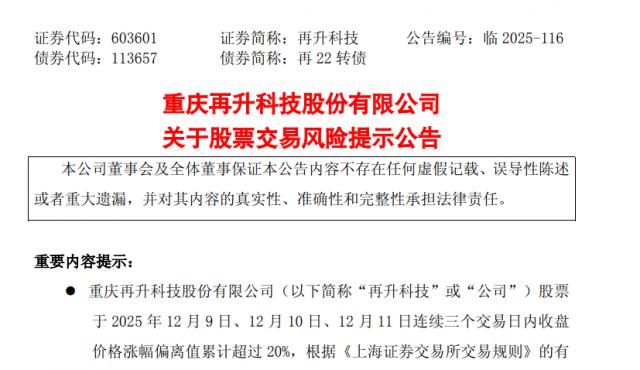 公告指出,再升科技股票于2025年12月9日、10日、11日連續(xù)三個(gè)交易日收盤(pán)價(jià)格漲幅偏離值累計(jì)超20%,屬于交易異常波動(dòng)。截至12月12日,公司股票繼續(xù)漲停。