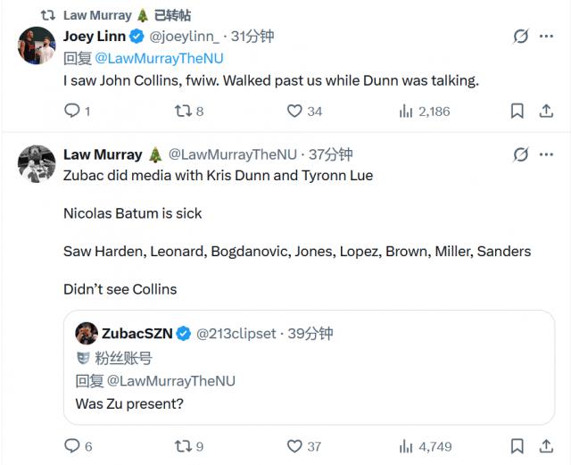 另一位快船隨隊記者喬伊·林恩在社交媒體發(fā)文稱:“我看到了約翰·科林斯,在鄧恩接受采訪時,他從我們身邊走過。”