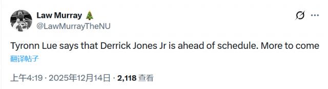 此外,泰倫·盧還談及了德里克·瓊斯的傷病恢復情況。他表示,德里克·瓊斯已開始參與一些三對三的訓練,恢復進度比預期更快。在11月17日對陣凱爾特人的比賽中,德里克·瓊斯膝蓋受傷,此后一直休戰(zhàn)至今。本賽季他僅出戰(zhàn)13場比賽,場均能得到10.5分、2.4個籃板以及1.1次助攻。