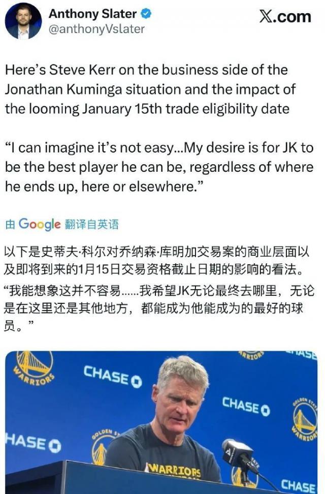 今年休賽期,庫(kù)明加與勇士簽下兩年4850萬(wàn)美元的續(xù)約合同,其中第二年為球隊(duì)選項(xiàng),他還放棄了交易否決權(quán)。這似乎暗示球隊(duì)早有計(jì)劃在本賽季中期為他尋找新東家,如今科爾教練對(duì)他的忽視,更表明雙方分道揚(yáng)鑣已成定局。