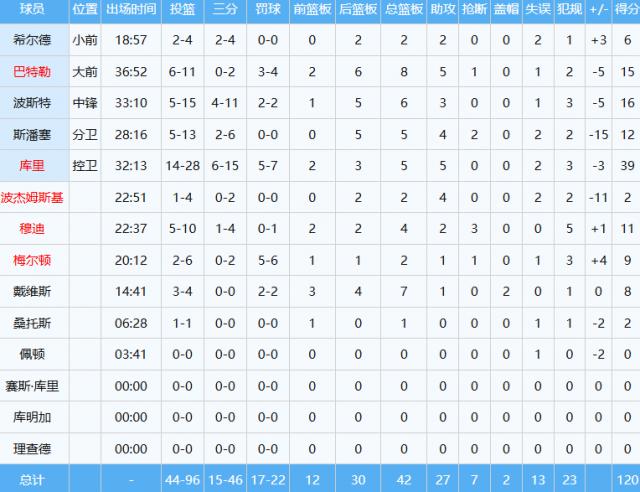 勇士隊(duì)本場(chǎng)數(shù)據(jù)如下: