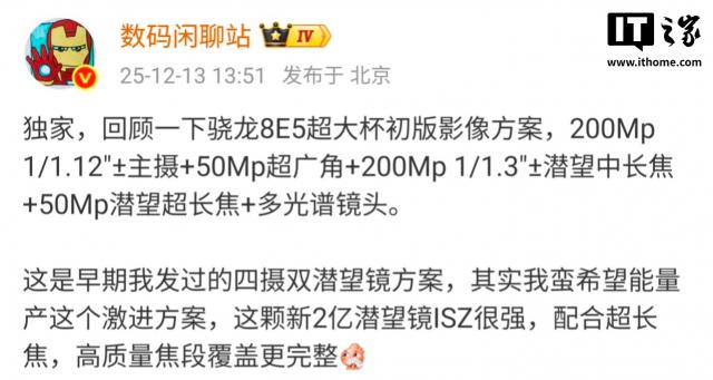 IT之家12月14日消息,博主@數(shù)碼閑聊站昨日透露了某廠商搭載驍龍8E5(第五代驍龍8至尊版)的超大杯機(jī)型初步影像方案,推測(cè)該機(jī)型可能是OPPO Find X9 Ultra。