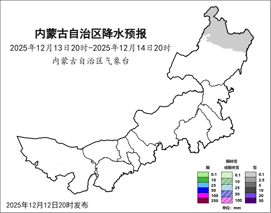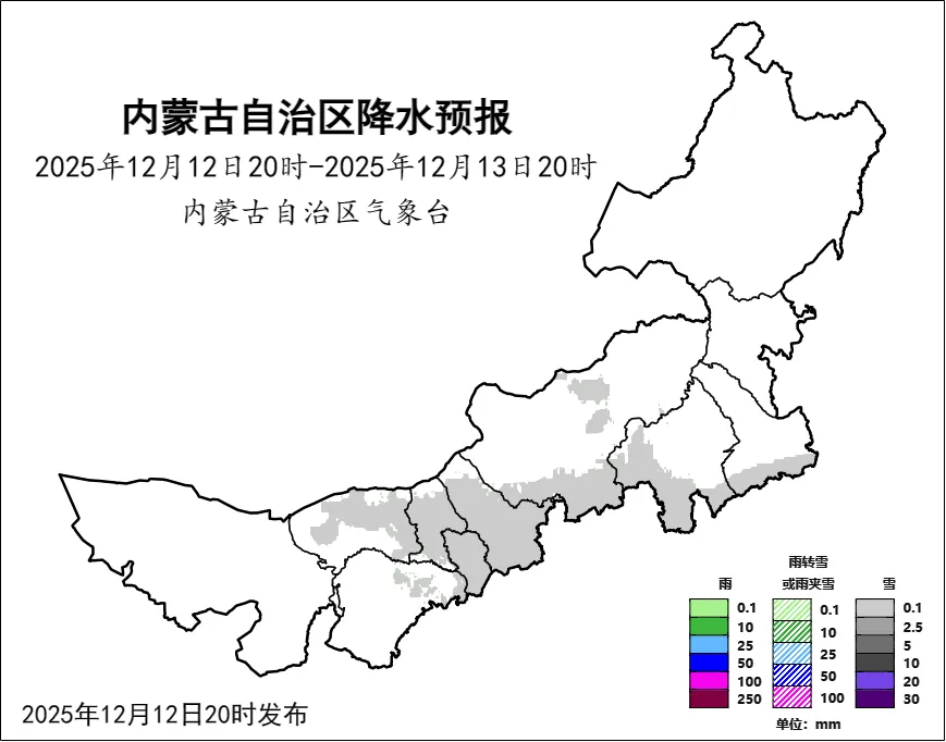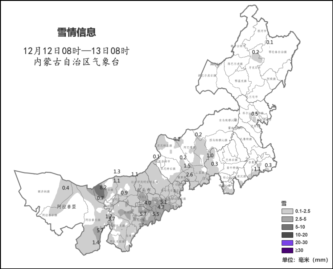 12月13日08時(shí),內(nèi)蒙古天氣發(fā)布第471期雪情信息:12日08時(shí)至13日08時(shí),內(nèi)蒙古11個(gè)盟市的63個(gè)旗縣中,共有330個(gè)站點(diǎn)觀測(cè)到降雪,降雪區(qū)域主要集中在呼和浩特市、鄂爾多斯市與烏蘭察布市。其中,呼和浩特市城區(qū)的最大降雪量達(dá)到5.1毫米。