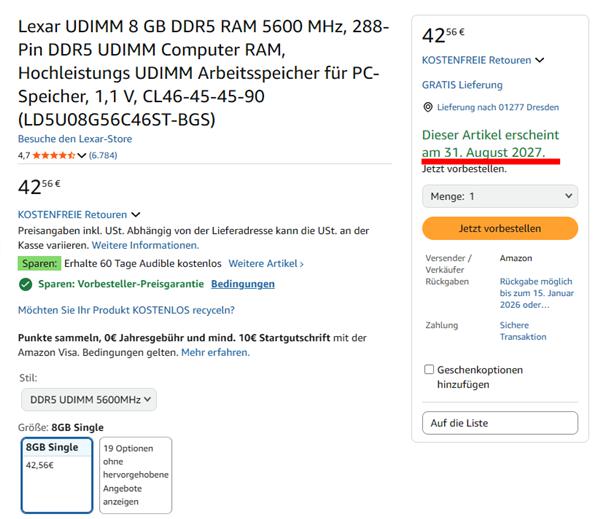 然而問題在于,該內(nèi)存雖已開啟預(yù)售,發(fā)貨時(shí)間卻定在2027年8月31日,消費(fèi)者需要等待超過20個(gè)月才能拿到貨!