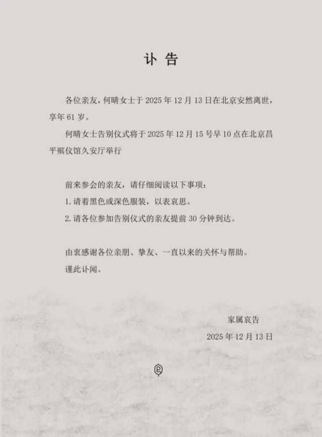 2025年12月13日,她在北京離世,享年61歲。