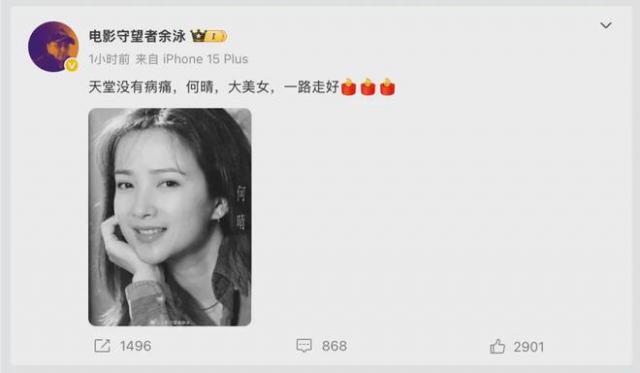 12月14日,余泳在社交平臺(tái)發(fā)布了一張黑白肖像照,正式確認(rèn)了何晴離世的消息。