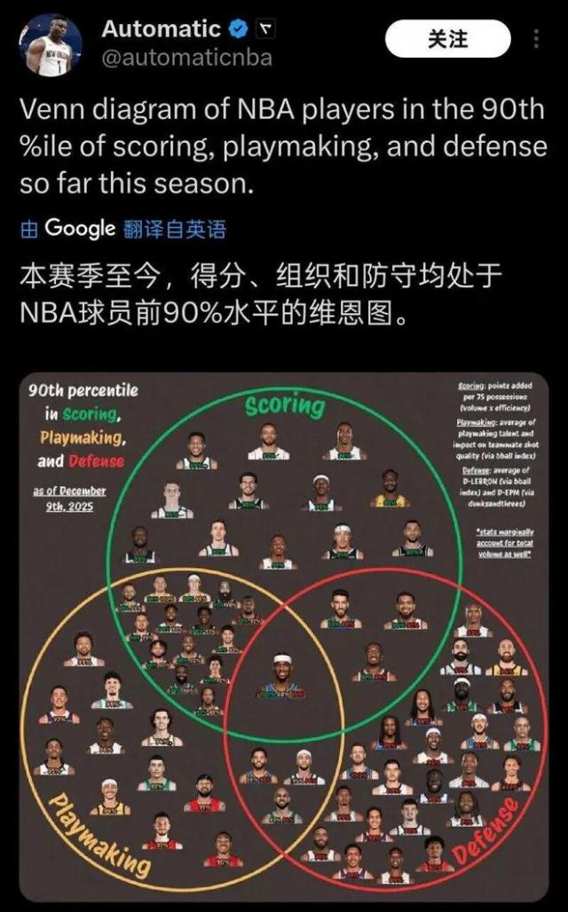 得分、組織和防守均在NBA球員前90%的,僅亞歷山大一人。