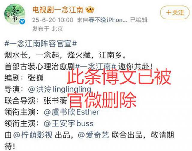 然而令人意外的是,在虞書欣新劇《雙軌》空降播出、同時(shí)官宣新劇《云初令》的節(jié)點(diǎn),《一念江南》卻做出刪除官宣博文并取關(guān)虞書欣的舉動(dòng)。難道虞書欣已退出該劇?或是劇方更換了女主人選?